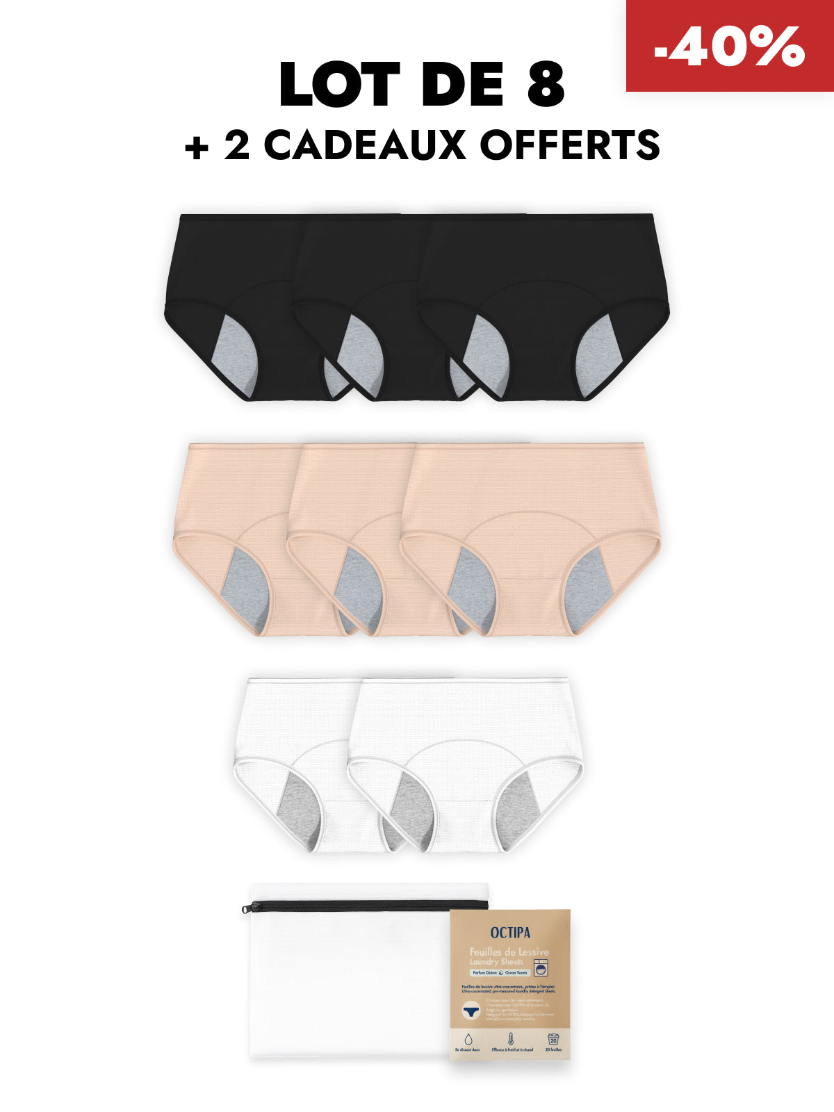 Les culottes Octipa sont conçues pour offrir un confort durable tout au long de la journée. Selon votre flux et vos besoins personnels, vous pouvez les porter en toute confiance pendant environ 12 heures.