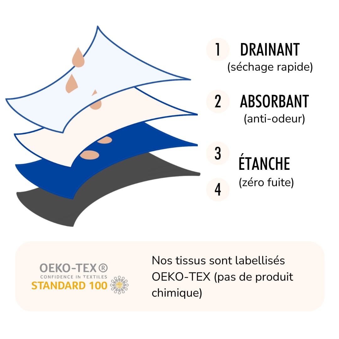 L’innovation de nos culottes se trouve dans leur doublure imperméable qui offre une absorption efficace et fiable pour vous accompagner dans toutes vos activités.