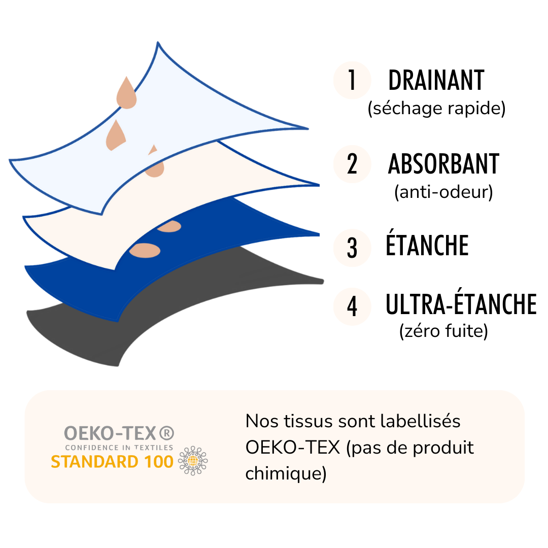 Cette conception assure que même en cas de fuites, vous restez au sec et à l'aise tout au long de la journée, sans souci d'inconfort ou d'humidité.